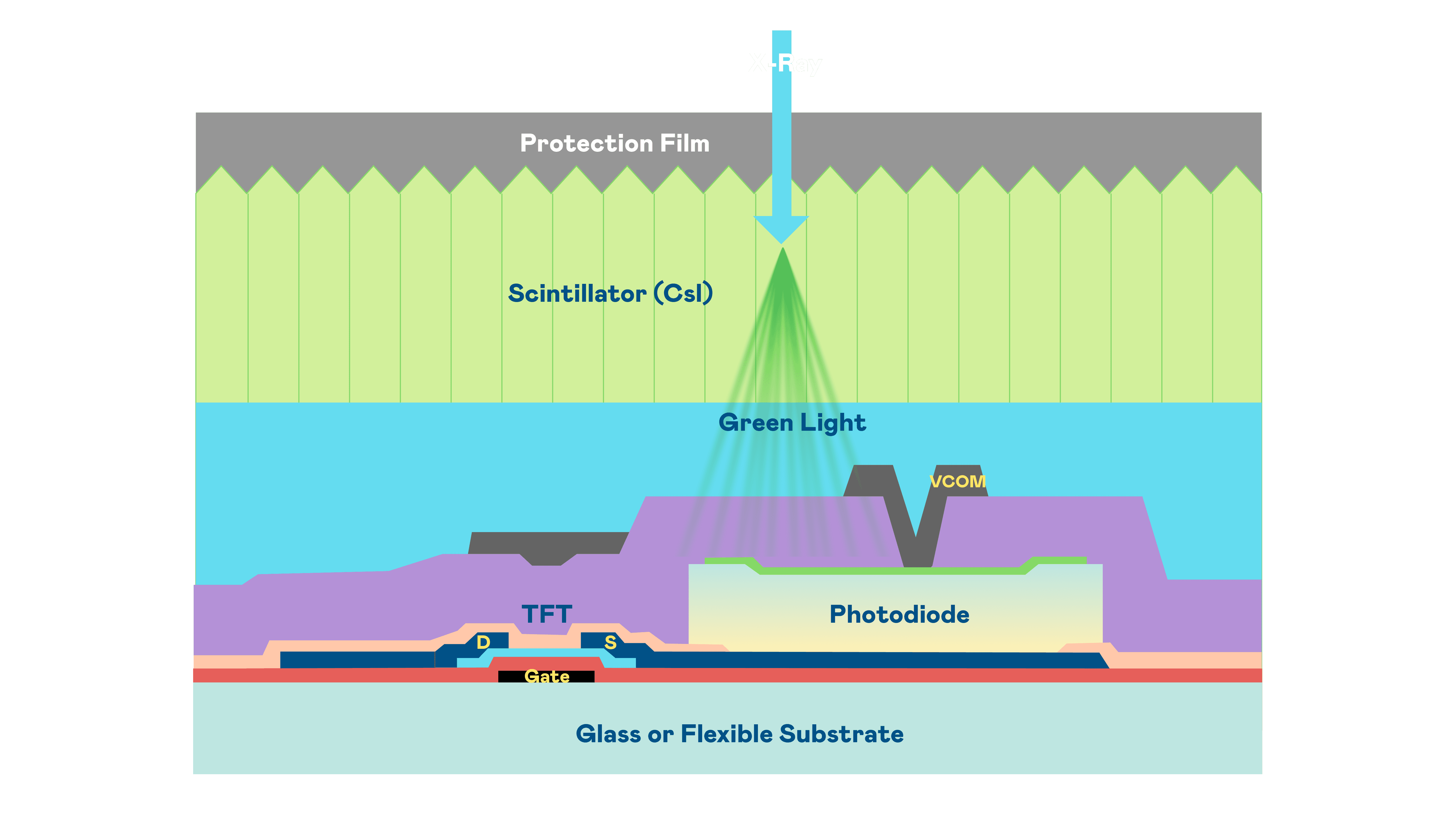 蓝狮在线的X光影像感测阵列使用薄膜电晶体 (TFT) 作为每个像素的读取开关,,,搭配光电二极体(Photodiode)的光电转换元件,,用以感测X光影像讯号。。。