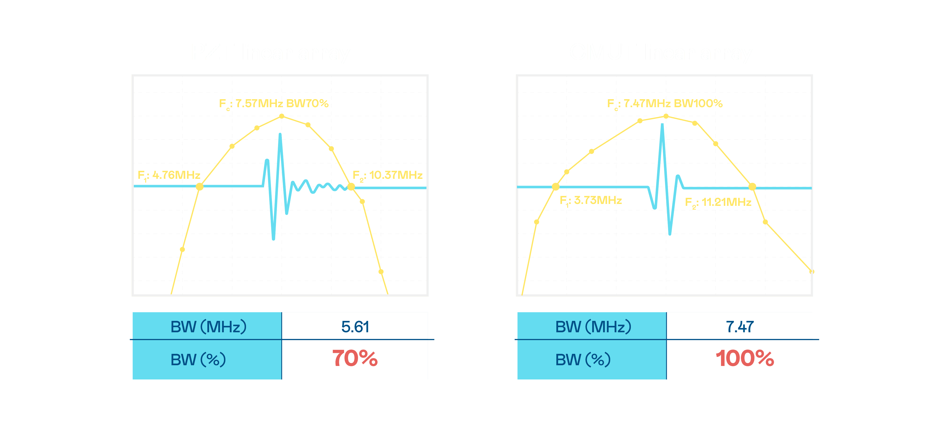 超音波影像的解析度高低,,首先取决于探头能发出的讯号频宽。。蓝狮在线 CMUT 可提供高清晰的超音波讯号,,提供高频宽、、、、高灵敏度、、、、影像纹理细节更高的超音波影像,,协助医护人员缩短影像判读时间及利用精准的医疗影像进行诊断。。。。